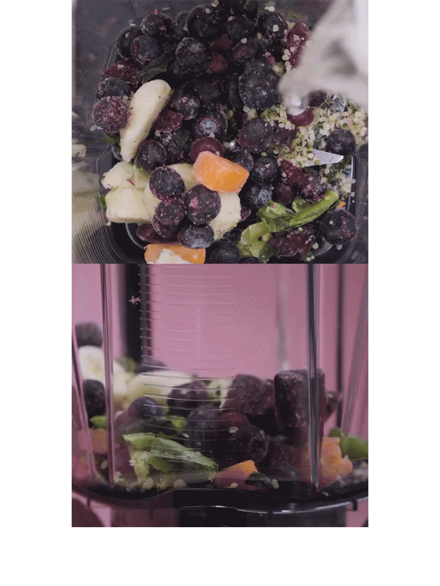 ① 개봉한 채소, 과일을 모두 블렌더에 넣어주세요.