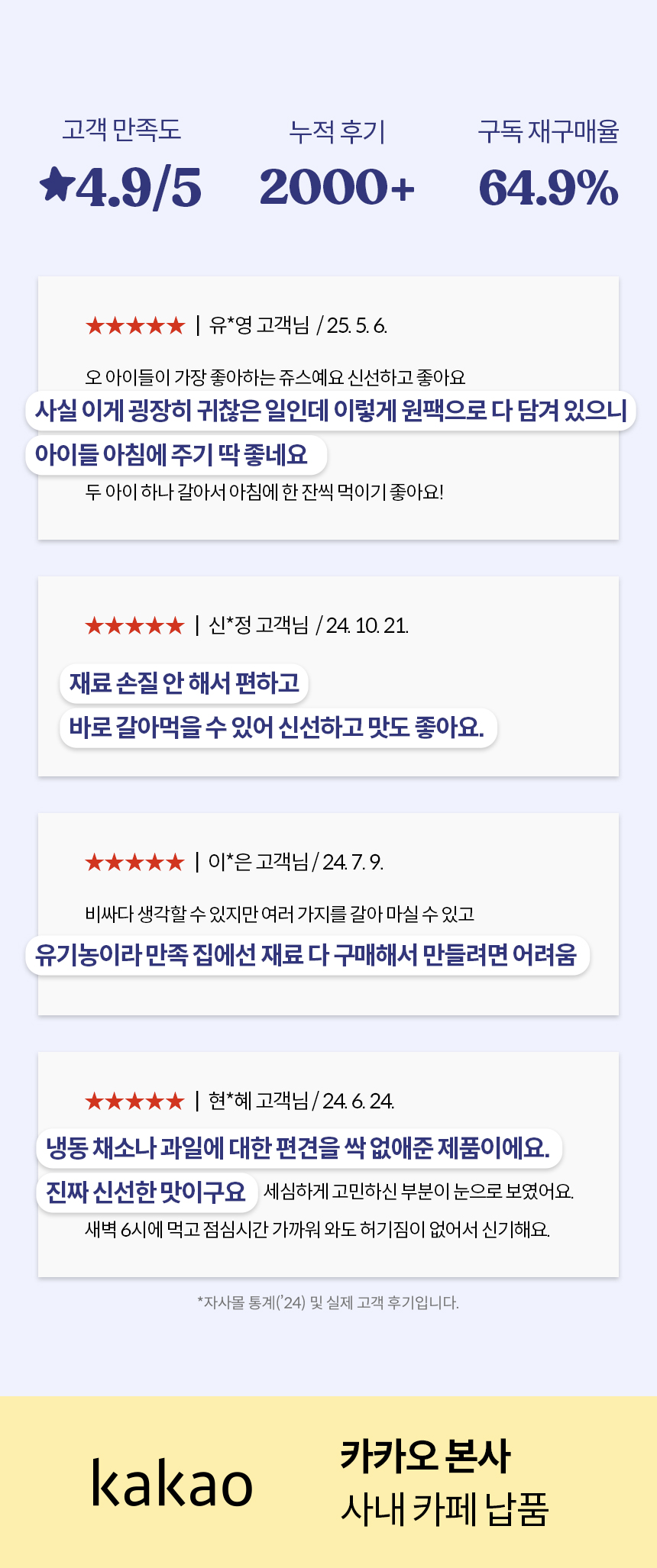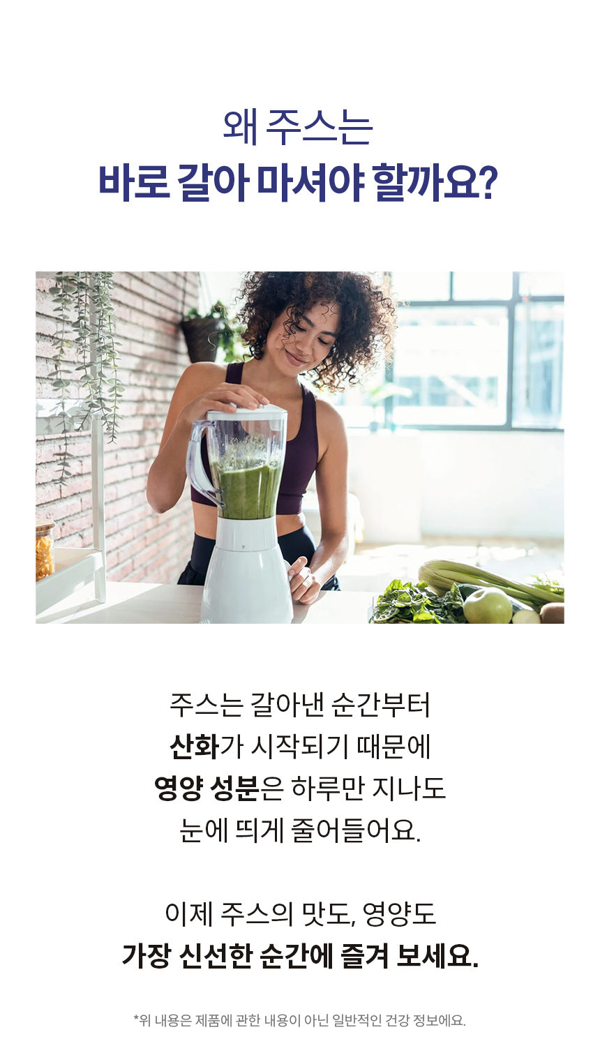 하지만 주스는 기호에 따라 다양하게 만들어드실 수 있기 때문에 제품별로 고객분들께서 작성해 주신 후기에 나와있는 "나만의 팁"을 참고해 주셔도 좋아요.