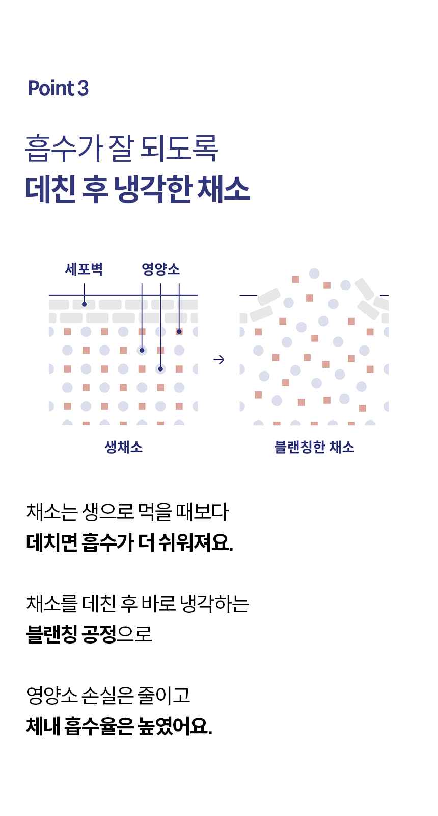 반대로, 블랜칭 시간이 길어지면 영양소 손실이 커져 각 채소별 특징에 맞게 블랜칭 시간을 조절해요.